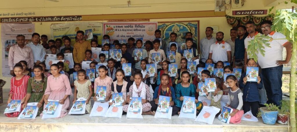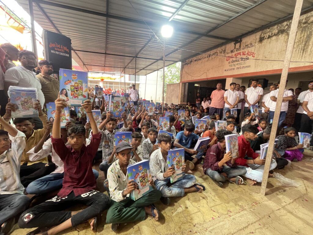 Distribution of customized writing notebooks to underprivileged schoolchildren by visiting government and semi-government schools across various cities in Gujarat every year